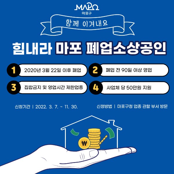 마포구, 폐업 소상공인 대상 재난지원금 50만원 지급