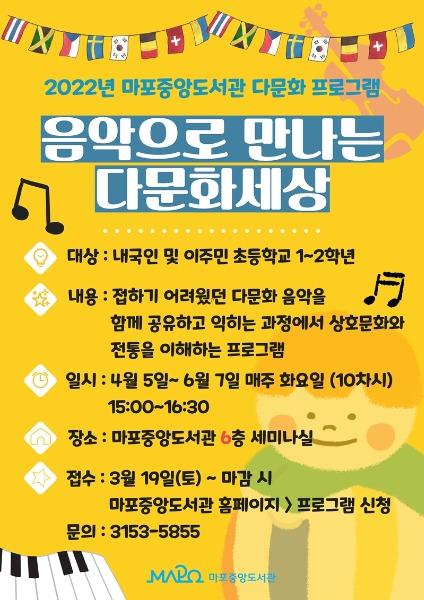 마포구(구청장 유동균)는 초등학교 1학년에서 2학년 학생을 대상으로 다문화 이해 프로그램인 ‘음악으로 만나는 다문화세상’을 이달 5일부터 6월 7일까지 운영할 계획이라고 4일 밝혔다.