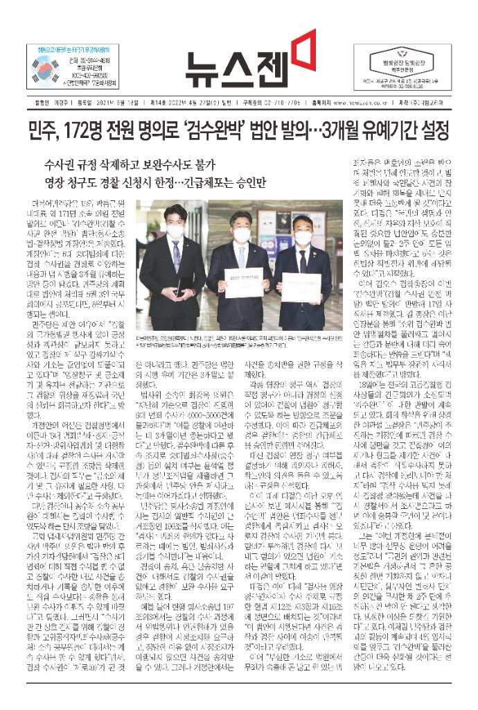 민주, 172명 전원 명의로 ‘검수완박’ 법안 발의... 3개월 유예기간 설정