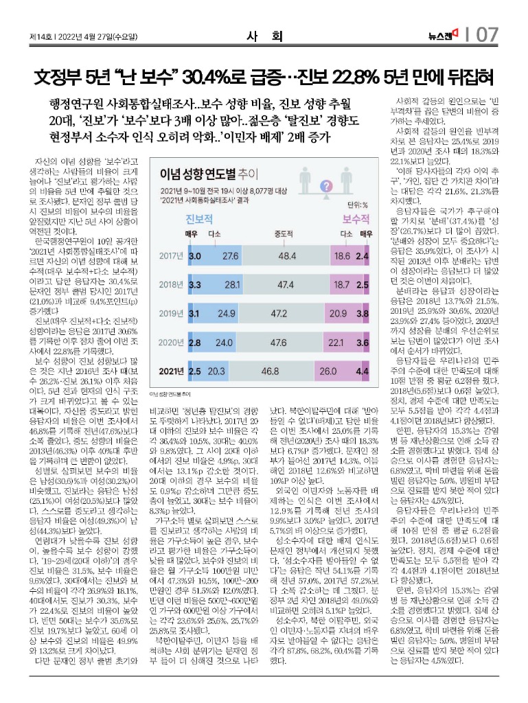文정부 5년 “난 보수” 30.4%로 급증…진보 22.8% 5년 만에 뒤집혀