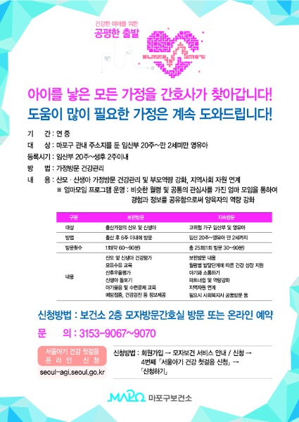 자세한 사항은 마포구 보건소 모자건강센터(02-3153-9067~9070)로 전화하면 안내 받을 수 있다.