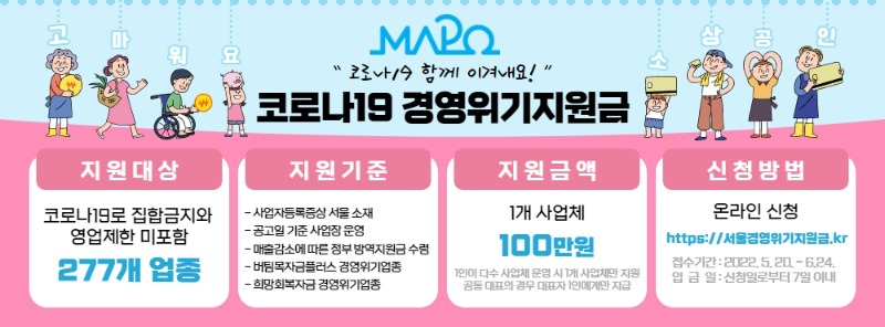 서울 마포구는 코로나19로 어려움을 겪은 277개 경영위기업종 소상공인에게 ‘경영위기지원금’ 100만원을 지급한다고 밝혔다.