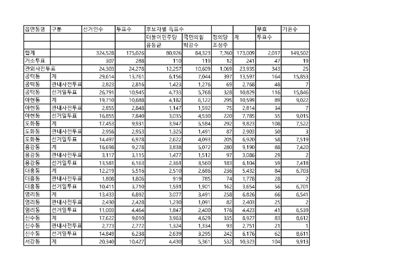 8회 지방선거 마포구청장 선거 후보별 득표현황 이우성 기자 발행 2022-06-02 09:23 국민의힘 박강수 후보 84,323표 더불어민주당 유동균 후보 80,926표 정의당 조성주 후봐 7,760표 글자작게 글자크게 Facebook Twitter band 네이버블로그 카카오스토리 카카오톡 ▲ 8회 지방선거 마포구청장 후보별 득표 현황 <저작권자 ⓒ 뉴스젠, 무단 전재 및 재배포 금지> 이우성 기자 다른기사보기