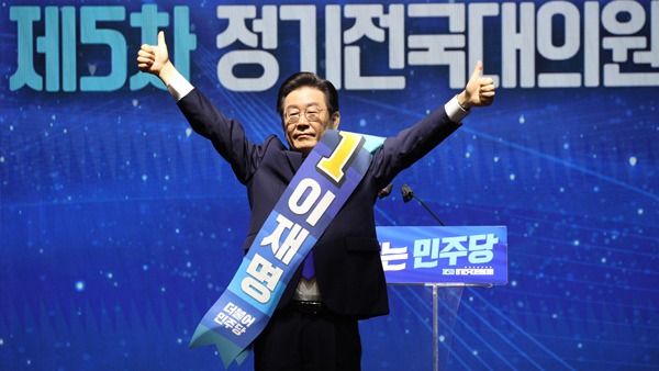 이 의원은 28일 서울 올림픽공원 체조경기장에서 열린 민주당 대의원대회에서 최종 합산 득표율 77.77%를 얻어, 박용진 의원(22.23%)을 꺾고 1위에 올랐다. 민주당은 △권리당원 투표(40%) △대의원 투표(30%) △일반국민여론조사(25%) △일반당원여론조사(5%) 결과를 합산해 당대표를 선출했다. 이 의원은 권리당원 투표(78.22%)·일반국민여론조사(82.26%)·일반당원여론조사(86.25%) 등에서 박 의원을 압도했다. 다만 이날 에이알에스(ARS) 전화로 진행된 대의원 투표에서는 이 의원(72.03%)과 박 의원(27.97%)의 다소 격차가 줄었다.