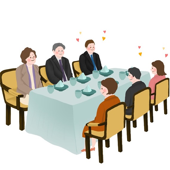 아버님 옆자리가 다른 가족이 앉는 자리입니다.아버님이 맨 처음 자리를 하시는것이 아니라 중앙에 자리를 하시는것이 좋아요. 처음 만나게 되면 양가 어른들을 소개하는데요. 예전에는 예비 신랑이 직접 양가 어른을 소개하거나 각각 당사자가 집안 어른을 소개하는 경우가 있습니다. 요즘은 각자 자신의 집안 어른을 소개하는 경우가 더 흔하다고 합니다. 소개할 때는 집안의 어른이신 아버지부터 먼저 소개하고 그다음에 어머니, 형제들이 참석했다면 형제들까지 순서대로 소개합니다. 이때 주의할 점은 반드시 손가락을 모두 모아 두 손 전체로 소개할 사람을 향하게 해야 합니다. 손가락질 절대 금지.!