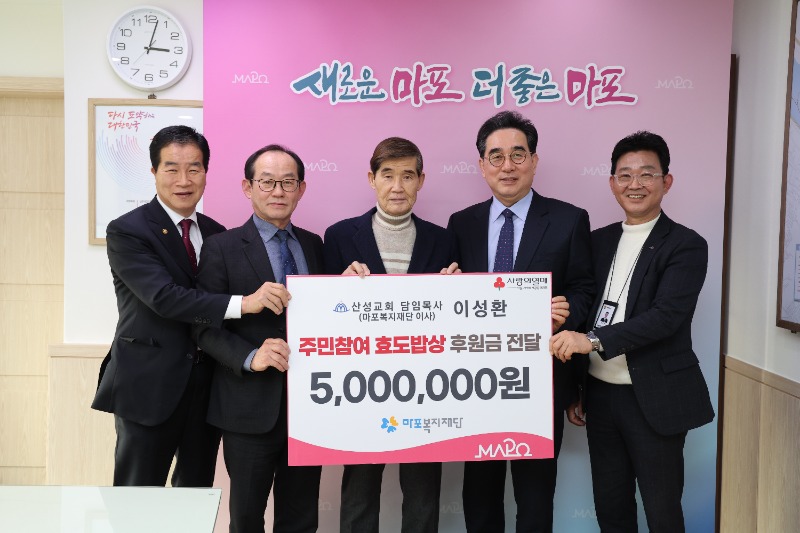 마포구 아현동에 소재한 산성교회 이성환 담임목사는 지난 1월 31일(화) 마포구청을 방문하여 「75세이상 어르신 주민참여 효도밥상」 후원금 5백만 원을 마포복지재단(이사장 이홍주)에 전달하였다.