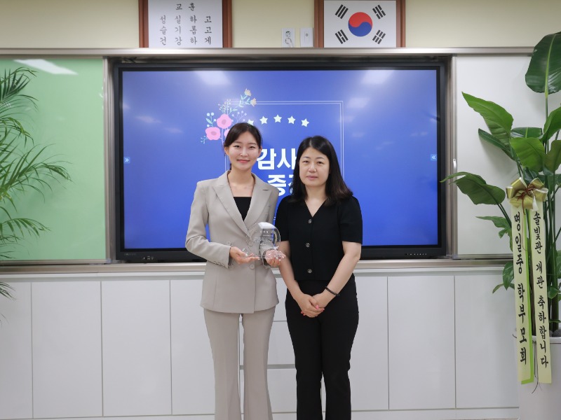 개관식과 함께 명일중학교는 김혜지 시의원에게 감사패를 전달하면서 강동구 교육환경 개선을 위해 노력해준 것에 대해 감사의 뜻을 전했다. 이 감사패는 솔빛관 개관에 맞추어 학부모회가 준비한 것이다.