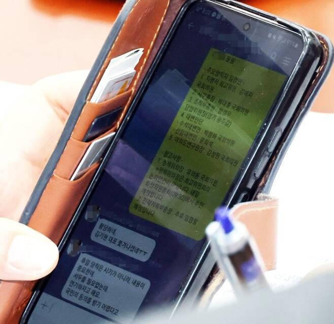 국민의힘 최고위원회의에서 조수진 최고위원과 김성호 여의도연구원 부원장이 카카오톡으로 나눈 대화가 카메라에 포착됐다.