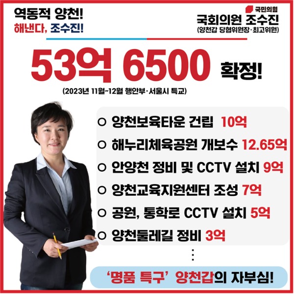 조수진 국민의힘 국회의원(서울 양천갑 당협위원장‧최고위원)은 5일 신정7동 양천구보육타운 건립에 필요한 서울시 특별교부금 10억 원을 추가로 확정했다고 밝혔습니다.