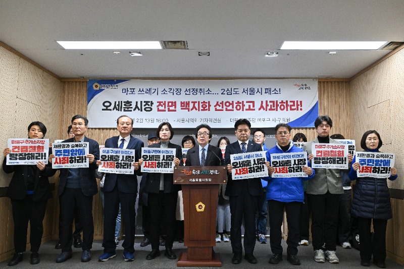 서울특별시의회 김기덕 의원(마포4, 더불어민주당)을 비롯한 더불어민주당 마포구 시,구의원 일동은 13일 오후 4시 서울시의회 의원회관 기자회견실에서 지난 12일 법원의 2심 판결인 △마포 소각장 선정 취소 및 △서울시 패소 판결을 선포하고, 오 시장의 전면 백지화 선언 및 사과 촉구에 대한 긴급 기자회견을 개최했다.